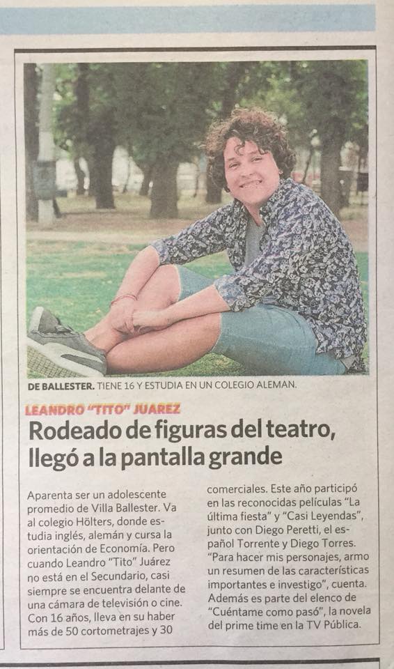 Leandro Tito Juárez tiene 16 años y ya actuó en películas junto a Diego Peretti, el español Torrente y Diego Torres. La condición de mis papás es no descuidar el cole, dice.